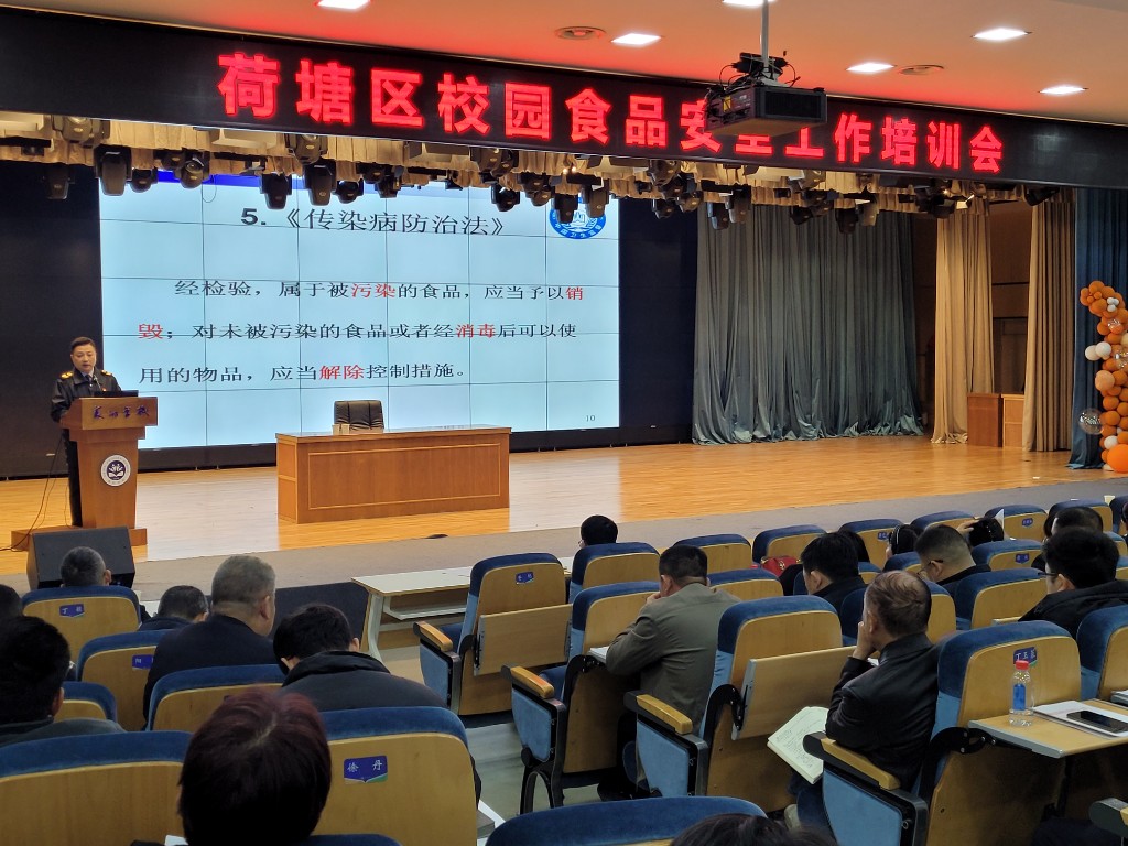 为全面排查和化解食品安全风险隐患,进一步提升校园食品安全管理水平,保障广大师生食品安全,3月21日,荷塘区在美的学校报告厅组织召开校园食品安全排查整治专项行动推进会暨食品安全工作培训会。区教育局、区卫健局相关负责人,辖区109所幼儿园、中小学、高等院校食品安全工作负责人等120余人参加。