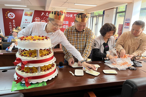 随着《生日歌》的响起,党员吴玲领唱生日快乐歌,三层的大蛋糕被推入现场,闪耀了现场,生日的党员们代表开心地吹灭了蜡烛,志愿者们将切好的第一块蛋糕送给了党龄50年的程国良,并分发给每一个现场的党员和志愿者,每人吃了三份甜蜜的蛋糕,大家脸上绽放了幸福美丽的笑容。