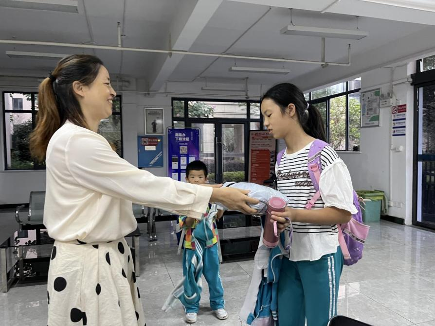 霞姐将周仲华购买的篮球网交到贺海洋的女儿手中