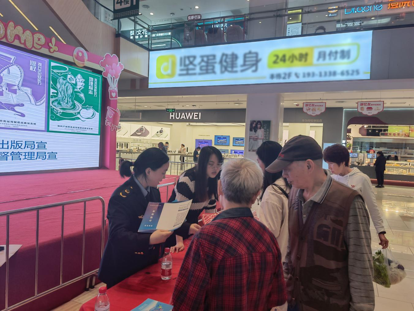 在第24个世界知识产权日来临之际,为切实做好荷塘区2024年知识产权宣传周活动,加强知识产权保护和运用宣传教育,全面提升社会公众尊重和保护知识产权的意识,区新闻出版局与区市场监督管理局以“知识产权转化运用促进高质量发展”为主题,在银泰财富广场联合举办2024年全国知识产权宣传周线下宣传活动。