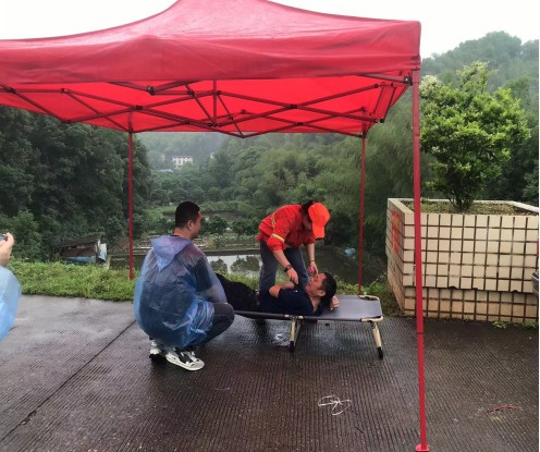 此次演练模拟持续降雨,太阳水库水位线超出警示线,对下流农户和农田造成冲击的背景展开。共设置应急响应、人员转移、安置救援三个科目。一旦水库水位超过警示线,便组织应急队伍先进行水位的预处理,利用大功率水泵进行不间断抽水。水位降低后,由应急队员组织附近村民转移,对小孩、孕妇、老人等行动不便的群众进行担架转移。人员转移到安全位置后,有受伤的村民便由随行医护人员进行救治。