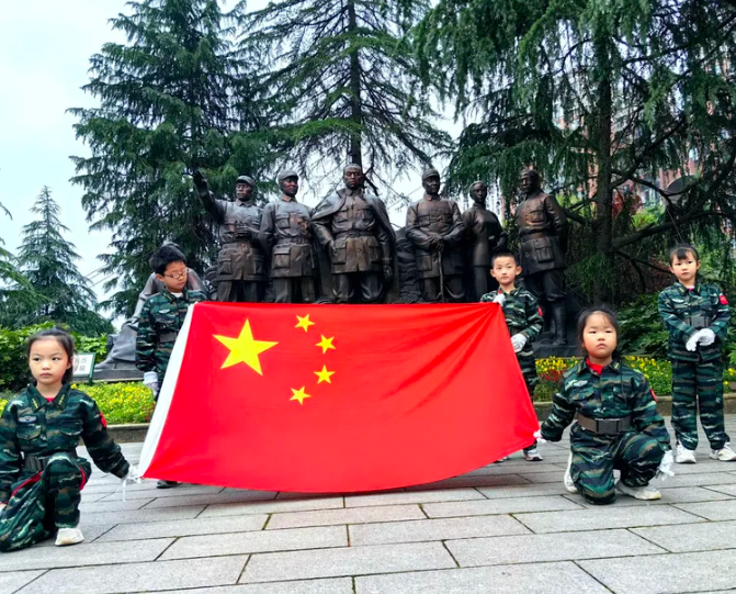 活动开始前,一群身着迷彩服的孩子们,在蓝天绿树的映衬下,举起鲜艳的五星红旗,站立在流芳园庄严肃穆的雕塑前,表达了浓浓的爱国之情,也拉开了活动的序幕。