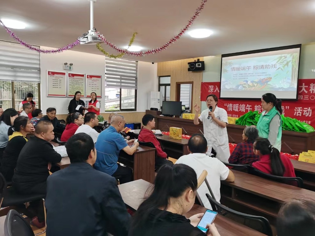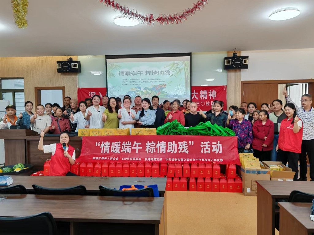 6月4日,为弘扬扶残助残的良好风尚,进一步丰富残障人士精神文化生活,营造关心关爱残障人士的浓厚氛围,在端午节即将来临之际,荷塘区残联联合宋家桥街道、蒲公英社会服务中心,链接了一批爱心企业与助残志愿者们,带着爱心粽子与水果等,深入430社区、东风村小区,与辖区残疾群众共同开展“情暖端午•粽情助残”为主题的端午节爱心慰问活动。