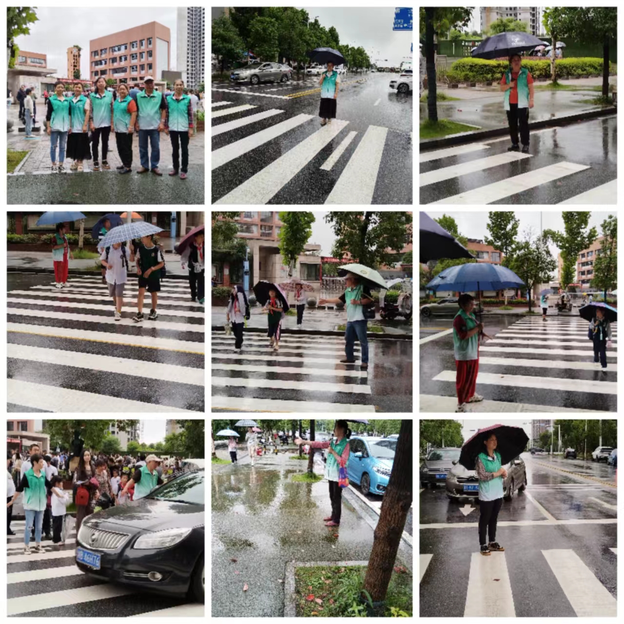 【图二】“桂在有你志愿服务中心”的志愿者冒雨助学护岗,学校门口疏导交通