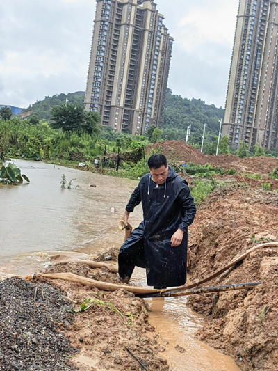 6月24日晚,暴雨再次袭来。次日凌晨,青塘社区书记贺斌闻汛而动,发现逸都花园二期围墙面临涝灾。贺斌多年抗击涝灾的经历,看到水位不断上涨,二期围墙低洼处的水从各处聚集,贺斌成竹在胸。在他的指挥下,荷塘开发区管委会和金城集团立即到位,社区工作人员立即联系物业和联户代表,线上线下通知业主将车移出车库。不一会儿,两台挖机到位,将水路挖通,从区政府协调来的龙吸水抽水泵迅速开启抽水模式。