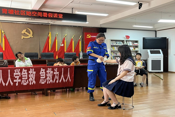 “人人学急救,急救为人人”。为丰富暑假课堂内容,普及医疗急救知识,进一步提高青少年的自救互救能力,7月8日上午,明照街道青塘社区她空间青少年课堂同荷塘区志愿者唐宁开展急救知识走进小区活动,唐宁为辖区30名青少年和家长上了一堂生动的应急救护知识科普课。