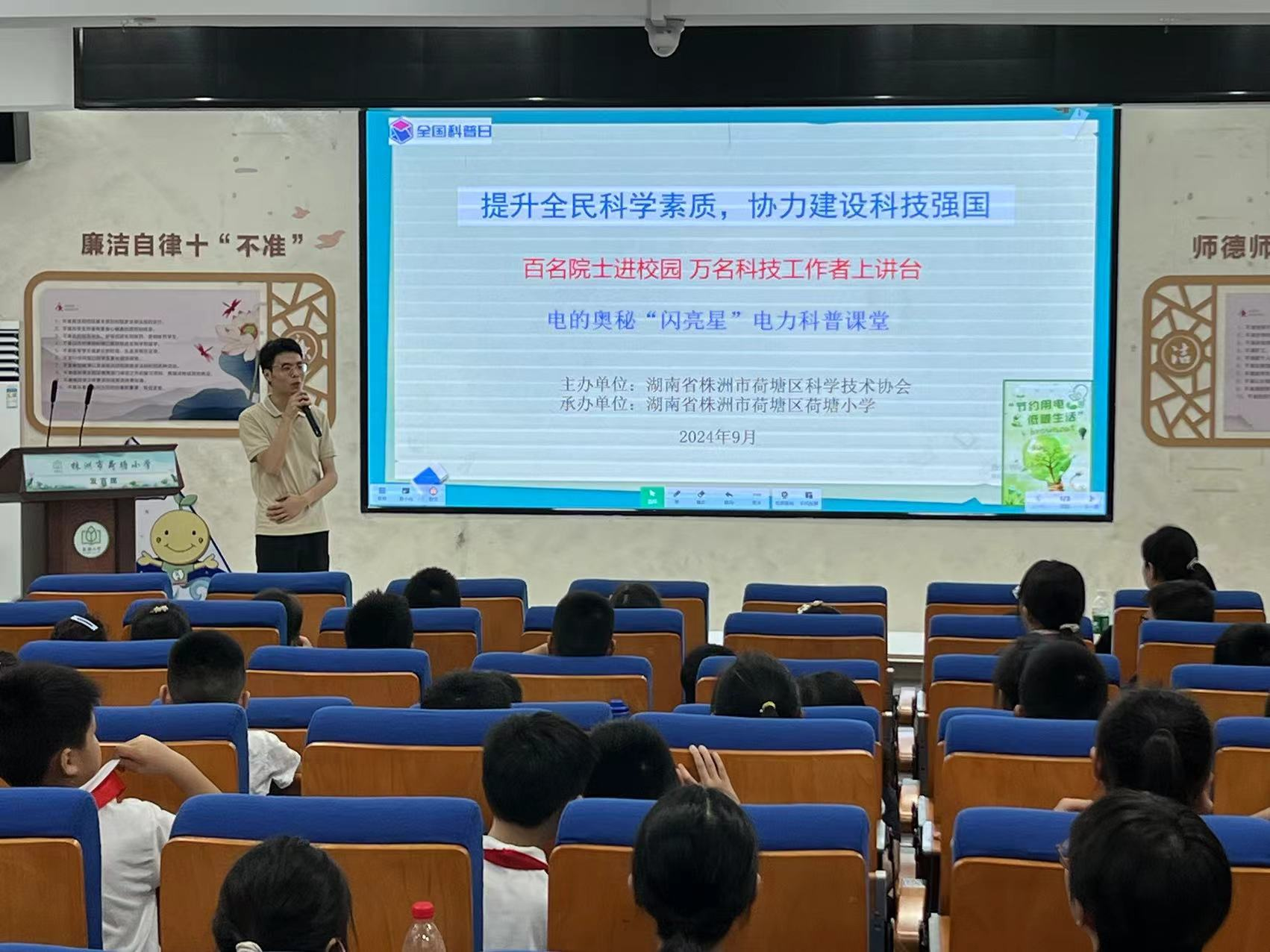 为迎接全国科普日的到来,启迪学生的科技梦想,全面提高学生综合素质。9月9日下午2点,荷塘区科协在荷塘小学多媒体教室组织开展一场以“提升全民科学素质,协力建设科技强国”为主题的探索电的奥秘“闪亮星”的电力科普讲座。本次活动邀请了国网株洲供电公司主值调度员,助理工程师陈希之为同学们授课,五年级的学生们260人参加活动。