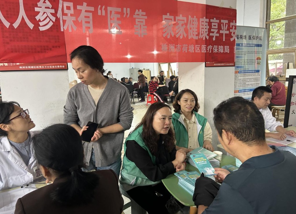 10月16日下午,株洲市荷塘区医疗保障局联合株洲市人民医院、宋家桥社区卫生服务中心、宋家桥街道芙蓉社区在领秀天下小区开展2024年全民参保集中宣传活动。