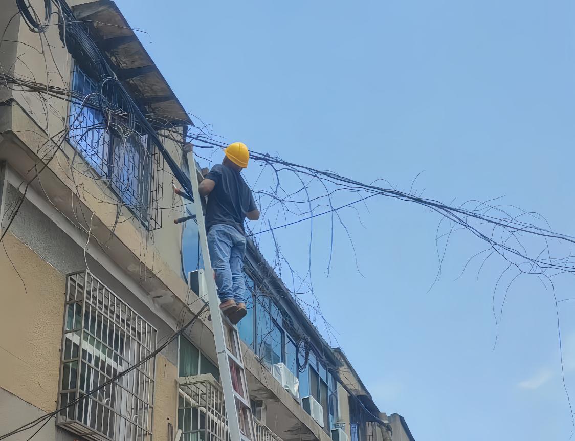杂乱无序的空中缆线,不仅影响城市容貌,也存在着一定安全隐患。为改善群众的居住生活环境,让基层治理工作惠及更广大群众,5月14日,第一批"空中飞人"出现在茨菇塘街道麻园社区,对由各种缆线搭建而成的空中"蜘蛛网"进行整理、梳理,未来2个月内,茨菇塘街道将协调株洲联通、移动、电信荷塘分公司、株洲广电、长城宽带等运营商对麻园社区内存在的空中缆线问题进行逐一整治,集中攻坚,努力提升城市"颜值"与"安全值"。