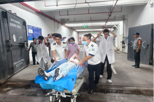 演练现场,医护人员用担架转运模拟“受伤患者”,消防员演示防烟防毒面具佩戴技巧,各环节紧张有序。“从发现火情到全员撤离仅用8分钟,伤员救治、火源扑灭同步完成,体现了多部门协同的高效性。”株洲市人民医院安全办负责人介绍,演练还设置了“伤员心肺复苏”“伤口简易包扎”等实操环节,让医护人员在模拟实战中提升急救技能。