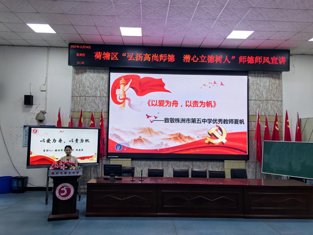 12月4日下午,株洲市荷塘区"弘扬高尚师德 潜心立德树人"师德师风宣讲活动(初中场)在株洲市第五中学多媒体教室温情启幕。荷塘区教育局党委副书记、副局长潘书巧,局人事股、局党政办工作人员,各初中学校书记、校长、专职副书记、中层干部、教师代表及宣讲团成员齐聚一堂,共同参与这场以教育为名、以师德为核的温暖对话。