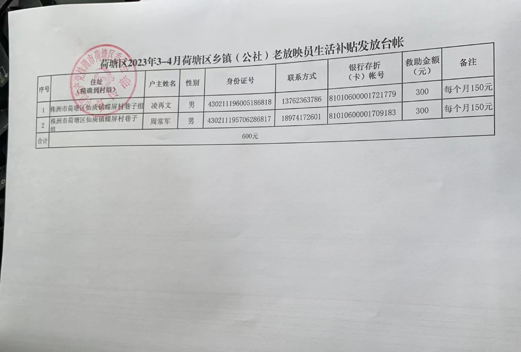 2023年3-4荷塘区乡镇(公社)老电影放映员生活补贴发放公示表
