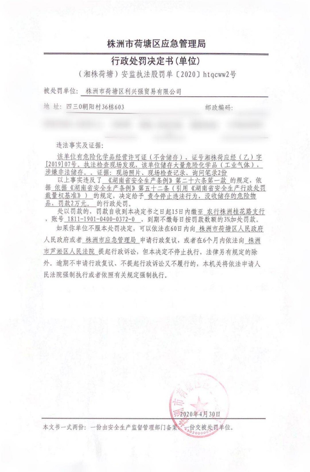 行政处罚决定书(单位)株洲市利兴强贸易有限公司