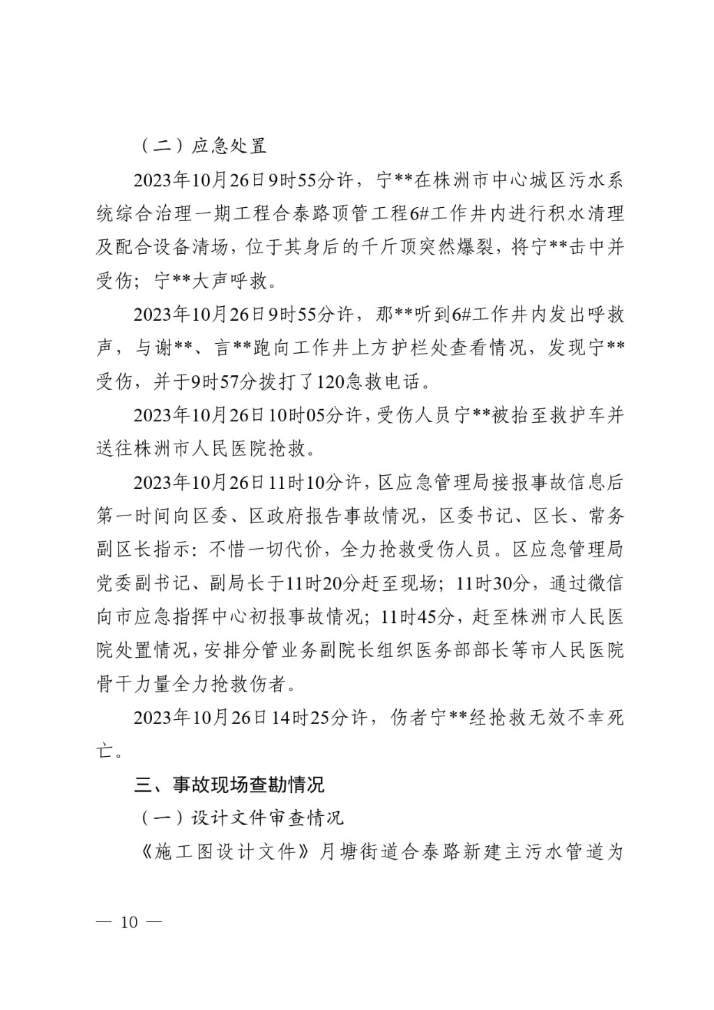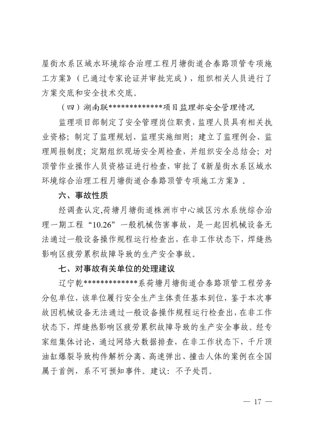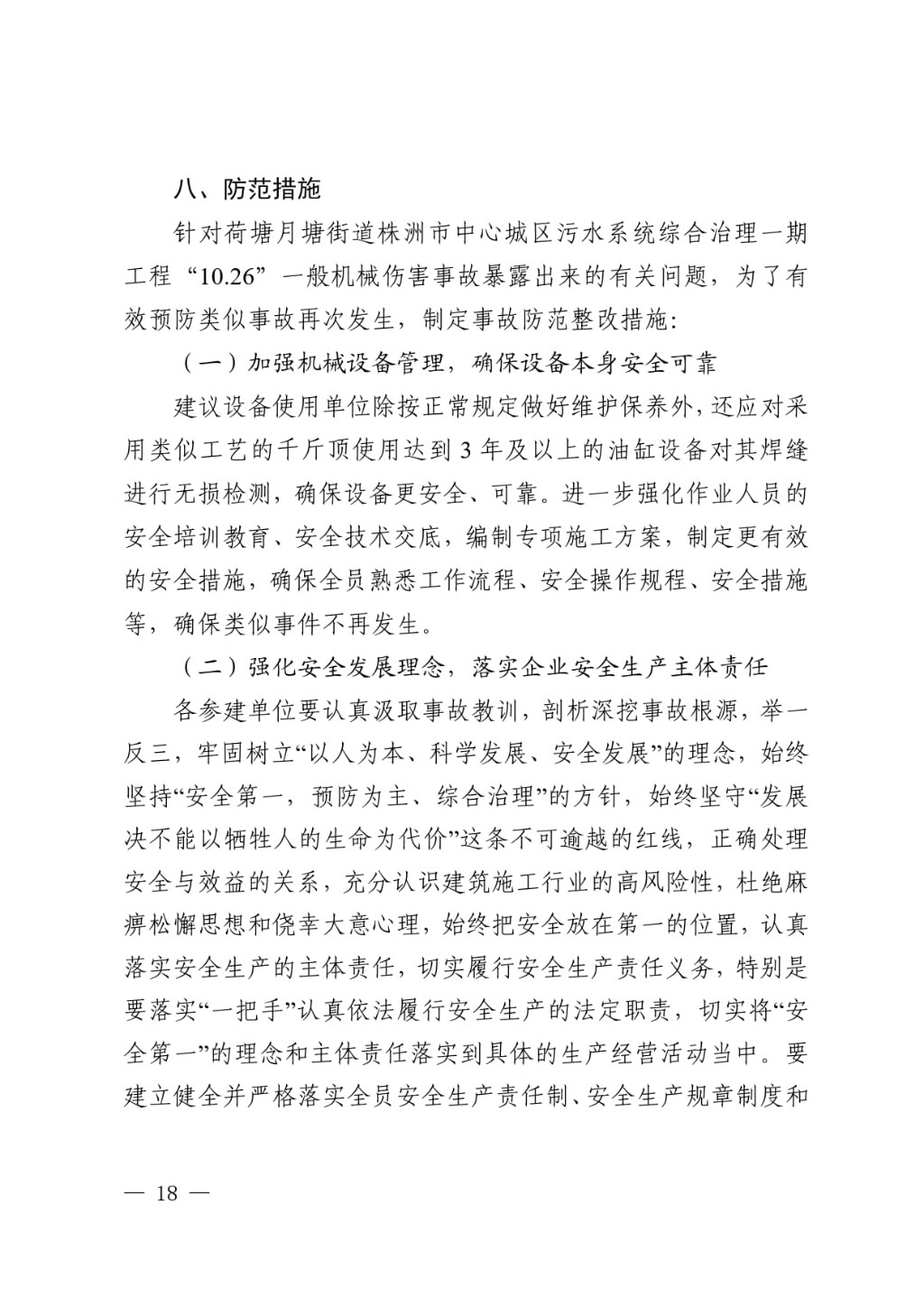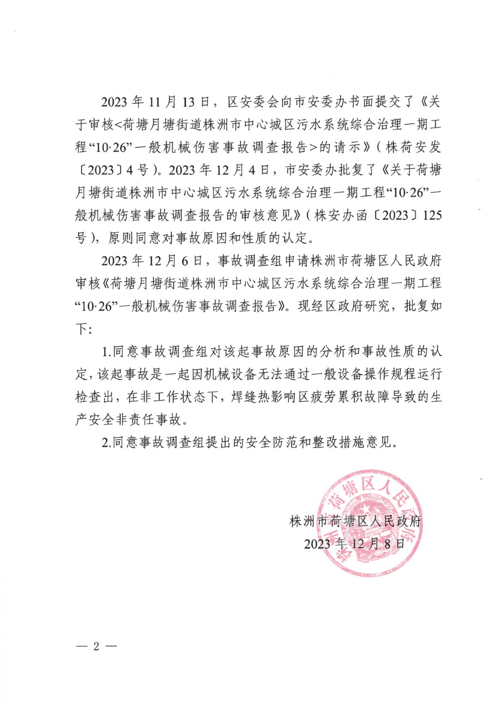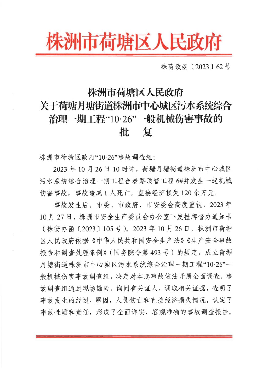 荷塘月塘街道株洲市中心城区污水系统综合治理一期工程“10·26”一般机械伤害事故的批复及调查报告