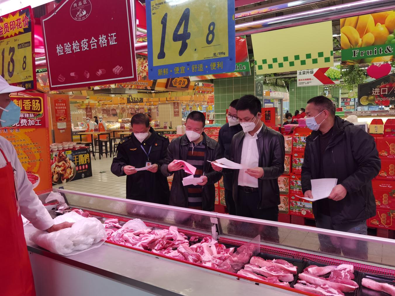 在大润发超市重点检查了生鲜、肉类、乳类等与群众生活紧密相关的食品,督察组一行仔细查看了各类食品的生产保质日期,询问了商家价格波动幅度情况,并叮嘱超市负责人一定要充分认识到食品安全工作的重要性,落实"日管控、周排查、月调度"工作制度,要不容敷衍地保障人民群众"舌尖上的安全"。