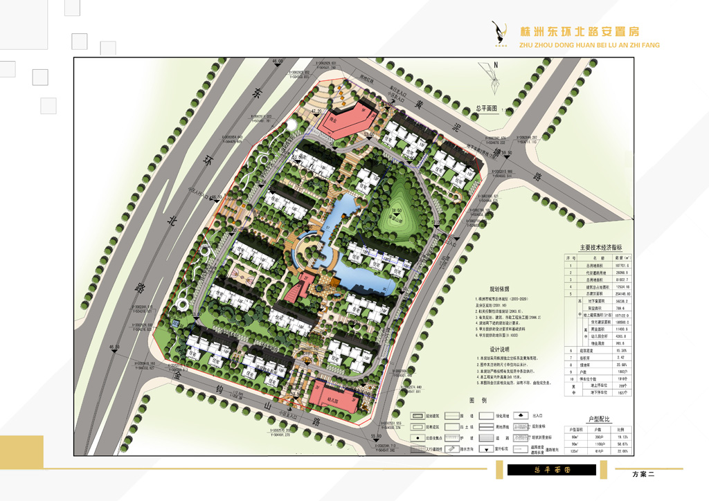 东环北路安置房项目用地位于东环北路与金钩山路交汇处。总用地面积约107701.6平方米;代征道路26098.9平方米;净用地面积81602.7平方米;容积率2.42;总建筑面积约25.41万平方米。其中:地下室面积56238.2平方米、架空层面积789.6平方米、计容面积197122平方米;其中:住宅建筑面积180500平方米、商业面积11490.6平方米、幼儿园及会所4365.8平方米、物业用房765.6平方米。总户数1882户;停车位1916个;其中地上停车位289个、地下停车位1627个。