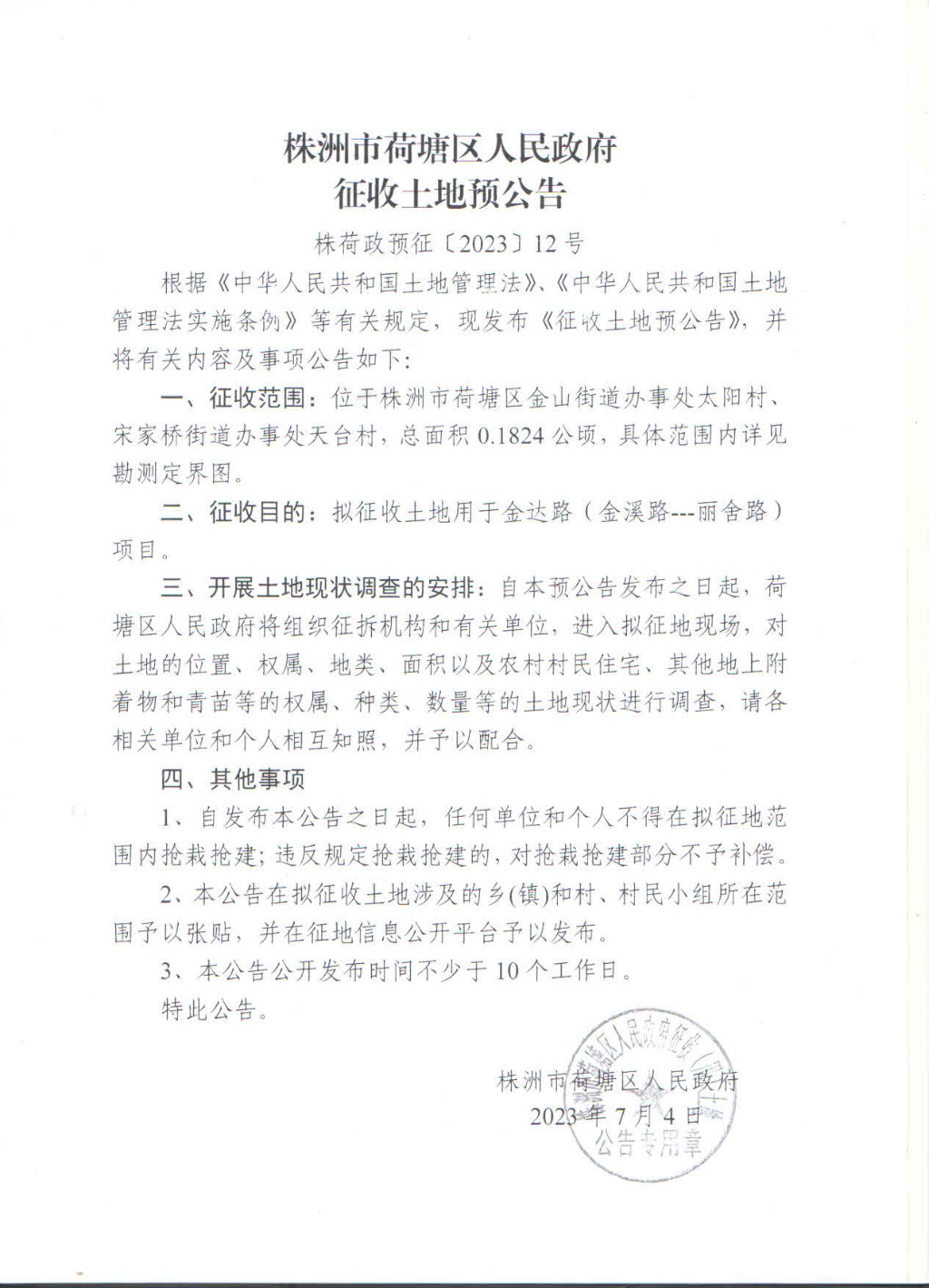 株洲市荷塘区人民政府征收土地预公告(株荷政预征〔2023〕12号
