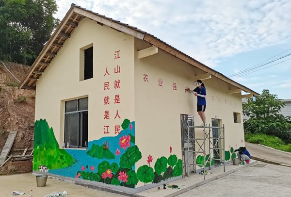 无惧骄阳,彩绘组的队员们来到一栋村集体房屋,围绕乡村振兴所取得的成果,以“农村美 产业强 农民富”为主题,用融合“荷塘”元素的墙绘提升新农村的“颜值”,形成了一道独具荷塘韵味的靓丽风景线。