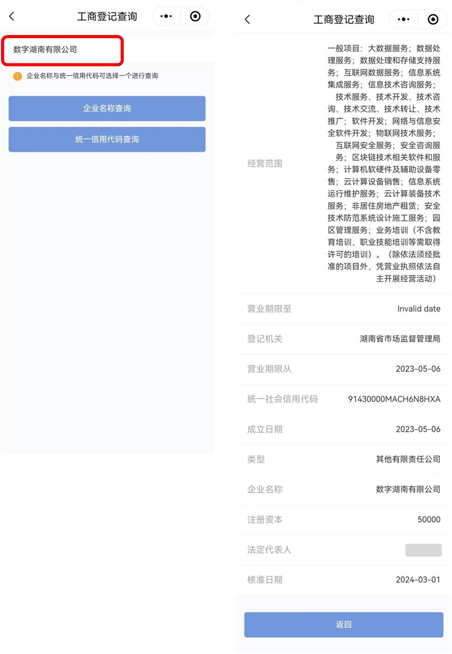 选择“工商登记查询”服务,输入企业名称或企业统一社会信用代码,即可查询企业与个体工商户的登记信息,包括企业经营范围、营业期限、成立时间、注册资本、法定代表人等。