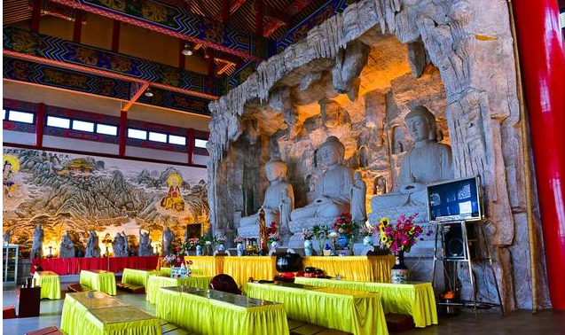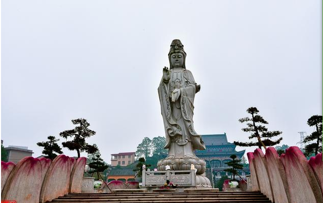 龙山之下,有一放生池。放生池是一朵直径为60米长的莲花造型,中间为观音台,建有一高达9.9米的露天滴水观音像。 独特的地理位置,悠久的历史传承,让这里与生俱来就有着一种佛教圣地的庄严、肃穆。