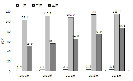(二)产业结构不断优化。全区三次结构比由2011年的1.9:63.9:34.2调整至2015年的1.86:57.34:40.8,服务业增加值增幅明显,工业增加值继续攀升,产业结构不断优化。