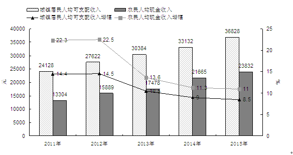 (四)人民生活日益富足。“十二五”期间,全区城镇居民人均可支配收入由24128元增加至36828元,农民人均纯收入由13304元增加至23832元,增幅明显。