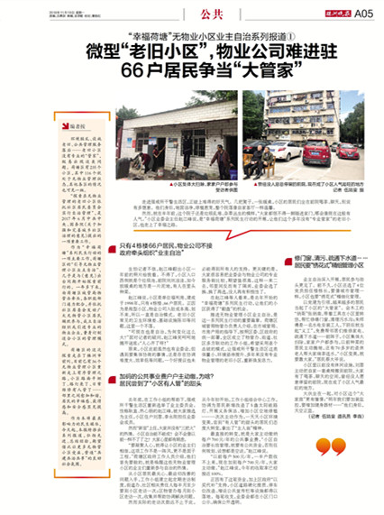 作为本埠最具影响力的民生媒体,今天起,本报特推出系列报道,弘扬先进、总结经验,期望借此让更多无物管小区受益,营造“共建共治共享”的良好社会氛围。