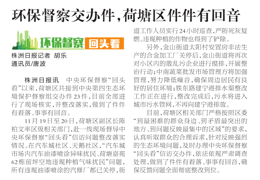 株洲日报讯 中央环保督察“回头看”以来,荷塘区共接到中央第四生态环境保护督察组交办件23件,目前全部进行了现场核实,并整改落实,做到了件件有着落、事事有回音。
