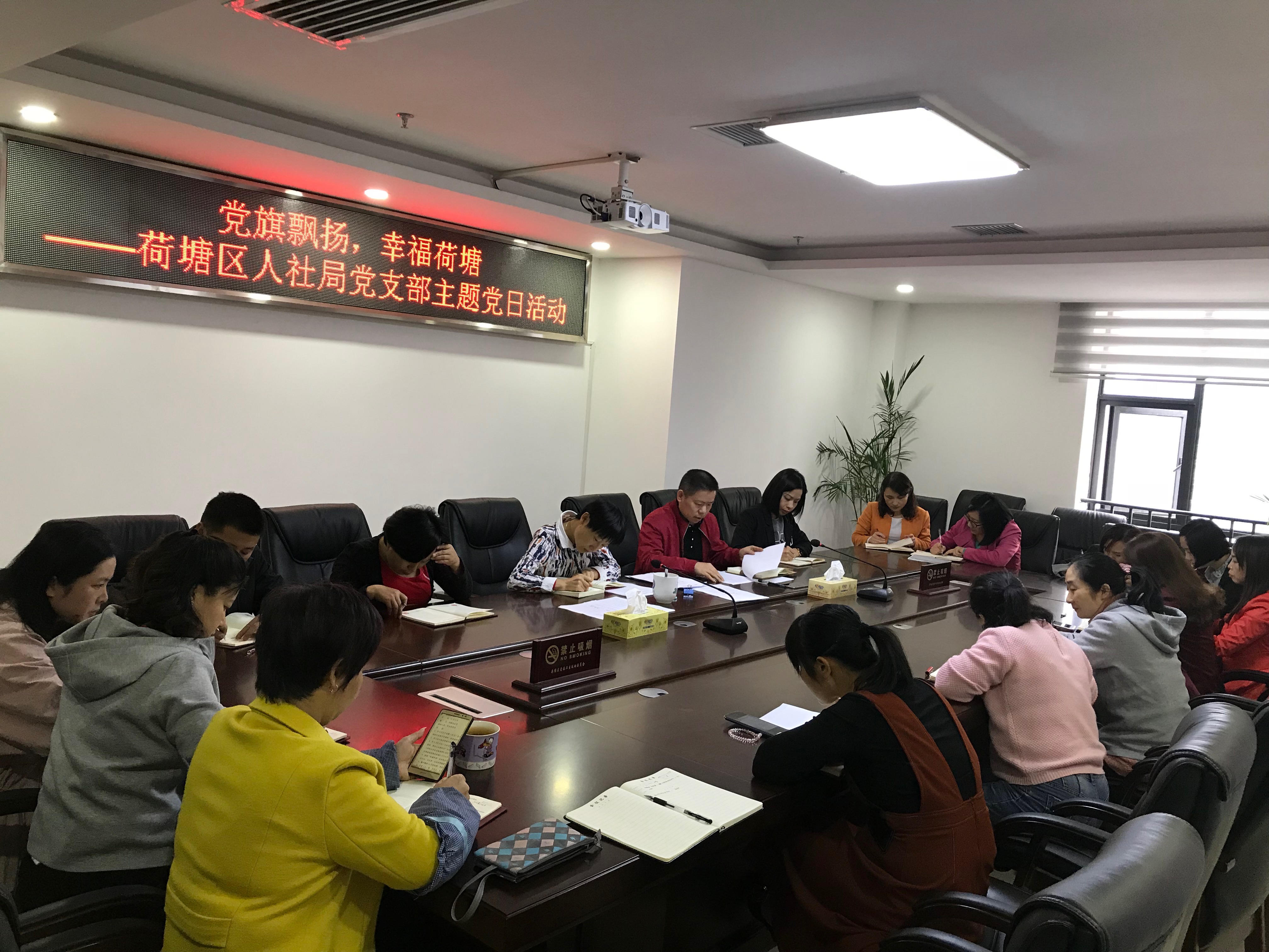 11月2日,区人社局支部在党员活动室组织开展“党旗飘扬,幸福荷塘”支部主题党日活动,会议由党支部组织委员宾海燕主持。