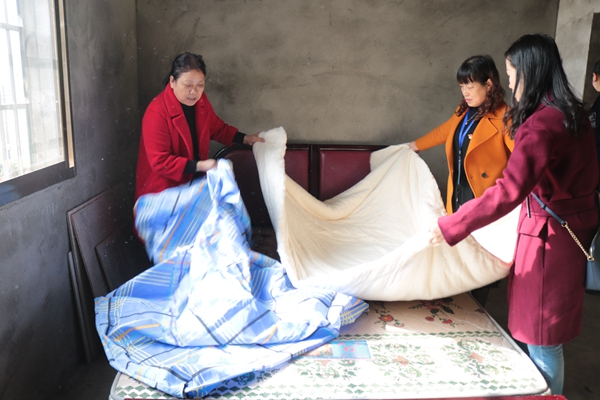11月22日上午10点,明照街道党工委委员潘书巧、星星村书记贺静芳、星星村群主钟利安一行将爱心床具和棉被等送到了五保老人余松林家里。余松林老人激动地说“街道办工作人员多次到我家里看我,帮我解决了很多生活上的难题。这次又给我送来爱心床具和棉被,真是太感谢党和政府了。”