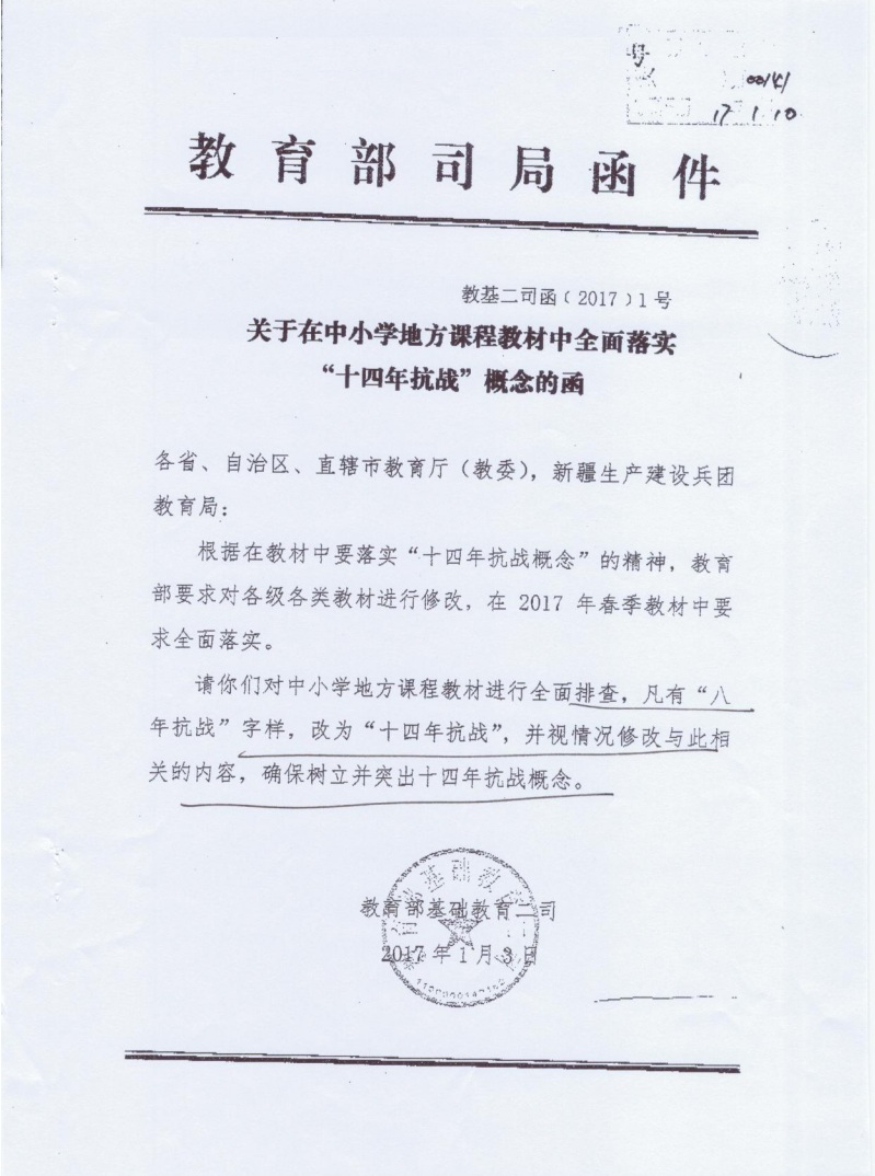 附件:《关于在中小学地方课程教材中全面落实“十四年抗战”概念的函》