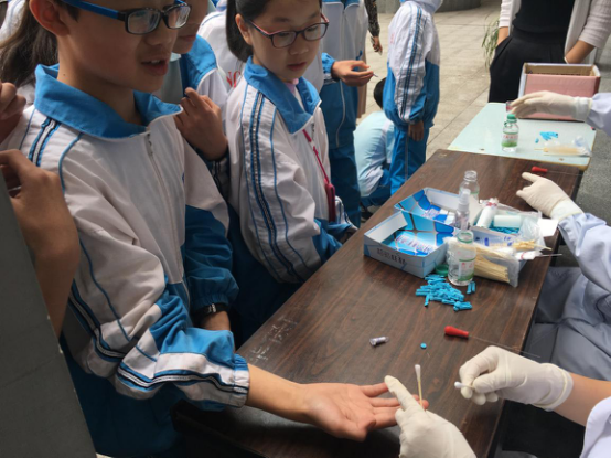 图为学生在校方的组织下,有条不紊排队采血