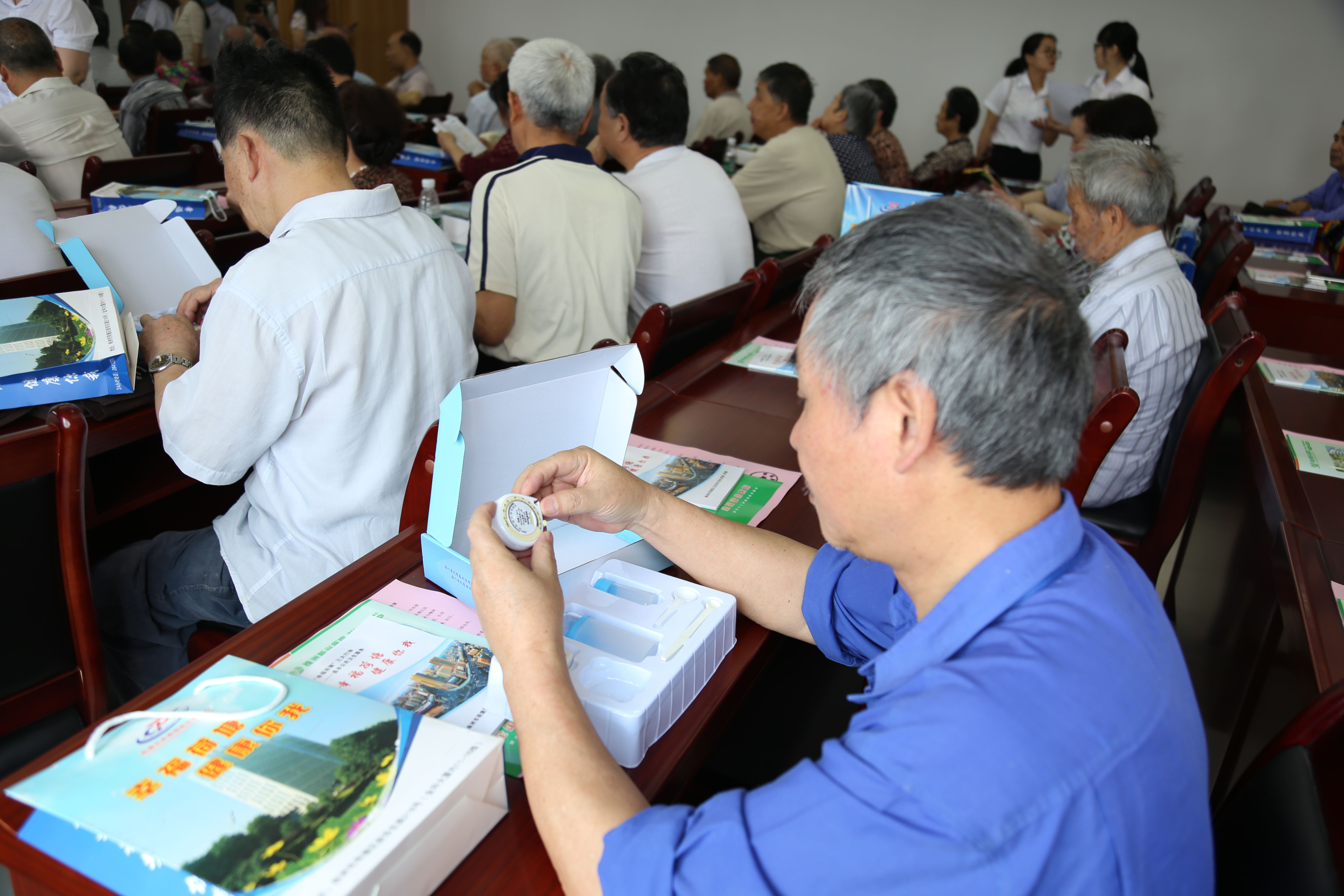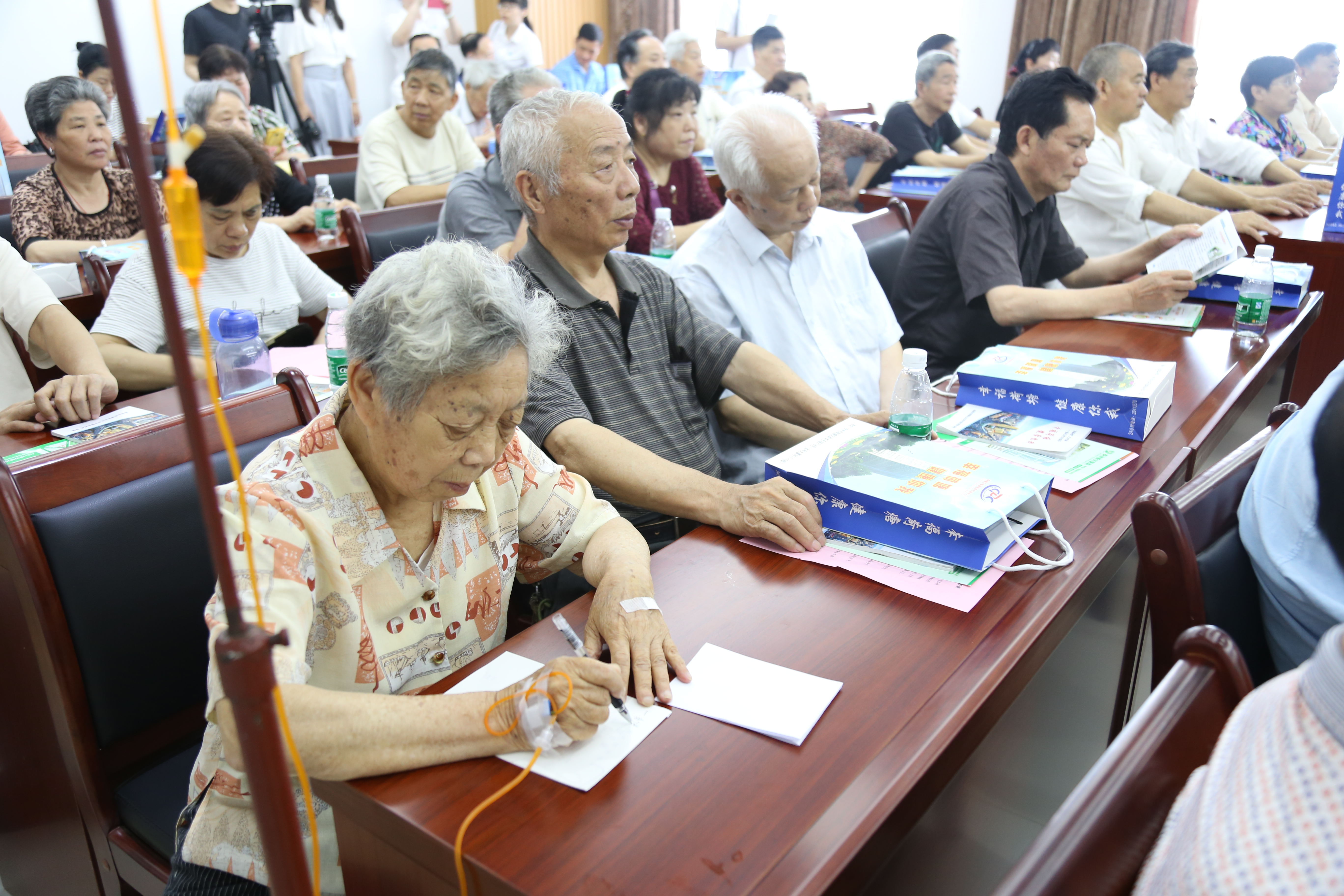 还在输液的会员在认真听课做笔记