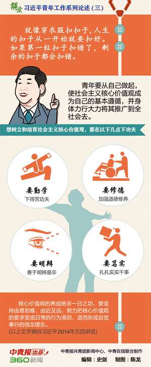 今日上线的第三篇解读,主题是“树立社会主义核心价值观——习大大为青年‘扣扣子’”。习总书记使用了生动的比喻来讲道理:“青年处在价值观形成和确立的时期,抓好这一时期的价值观养成十分重要。这就像穿衣服扣扣子一样。人生的扣子从一开始就要扣好,要努力把核心价值观的要求变成日常的行为准则,进而形成自觉奉行的信念理念。”