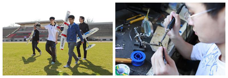 清华大学共有15家未来兴趣团队,“未来通信”、“未来航空”、“未来城市与新能源”……在这些团队后面支持的企业是波音、东芝这些大型跨国企业或者重点研究机构,学校团委是红娘,这些企业每年向学生团队支持10万~30万元的研究经费,向学生提供硬件、技术等支持。兴趣团队也有严格的机制,从跟着原有项目做到承担种子项目,从联合立项到团队核心项目,学生在这个过程中得到了锻炼。“未来航空”兴趣团队有一个作品,现在已经发展到第11代,这是一个通过舵机完成转向的飞行球,飞行球3年前诞生,现在由马来西亚留学生林家靖负责项目进展。