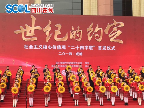 四川在线消息(四川在线记者 李天琪)31日,《世纪的约定——社会主义核心价值观“二十四字歌” 》在蓉首发,该歌曲由总政一级作曲家刘青担任谱曲,著名词作家陈涛担任作词。在仪式现场,成都七中管乐队、成都市实验小学小樱桃合唱团、成都石室中学合唱团、西南民族大学艺术学院学生合唱团、成华“金熊猫”教师合唱团、中国中铁二局开路先锋合唱团等团体分别以不同的形式诠释了这首歌的精神内涵。让我们来听听他们对《世纪的约定——社会主义核心价值观“二十四字歌”》的理解。