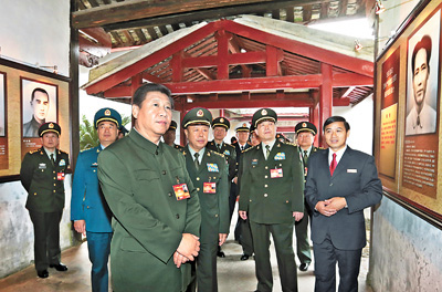 上午9时许,习近平来到会址前,亲切接见出席全军政治工作会议的全体代表,随后带领全体中央军委委员一起参观会址。习近平再次仔细观看了会址各个场所,在一幅幅照片和展板前驻足察看,并不时就有关问题向讲解员提问。他来到当年毛泽东作政治报告的厅堂,凝望着廊柱上富有鲜明战斗性的标语,注视着当年会议代表取暖留下的斑斑炭火印迹,同大家一起回忆先辈们探寻革命道路时筚路蓝缕、艰辛奋斗的情景,并向大家介绍他每次来古田参观的情形和感受。