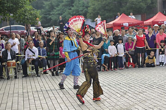 株洲市武术协会石峰分会周海泉和吴怀英带来的武术《功夫扇》,一抬腿、一开扇,武术动作干脆利索,让人眼前一亮。
