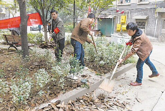 志愿者在花园一村清理小区卫生 记者 谢慧/摄