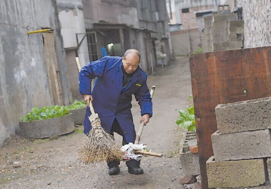 10日,李国华在打扫门前小巷的卫生 记者 谢慧/摄